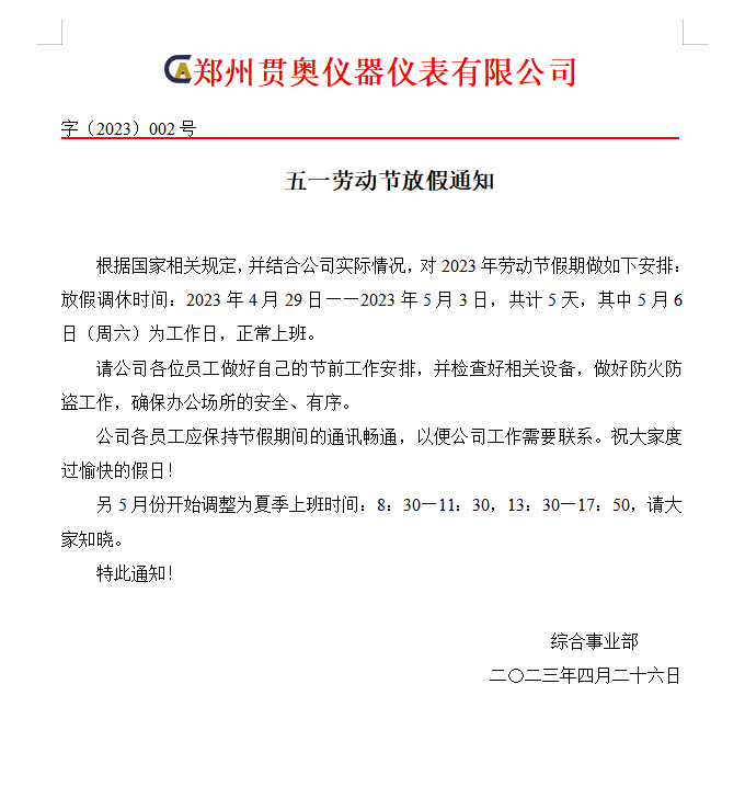貫奧儀器五一勞動節放假通知