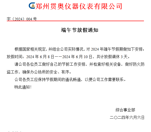 鄭州貫奧儀器2024年端午節放假通知